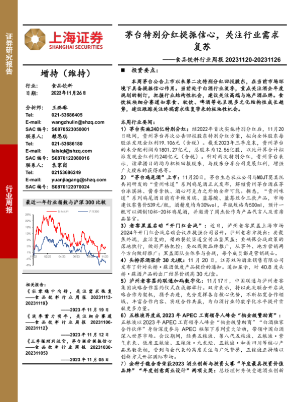 【上海证券】【20231126】20231126-上海证券-食品饮料行业周报:茅台特别分红提振信心,关注行业需求复苏-24页 行业研究
