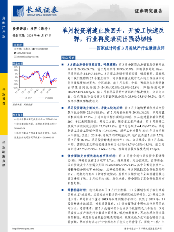 【长城证券】【20200417】国家统计局前3月房地产行业数据点评:单月投资增速止跌回升,开竣工快速反弹,行业再度表现出强劲韧性-9页 行业研究