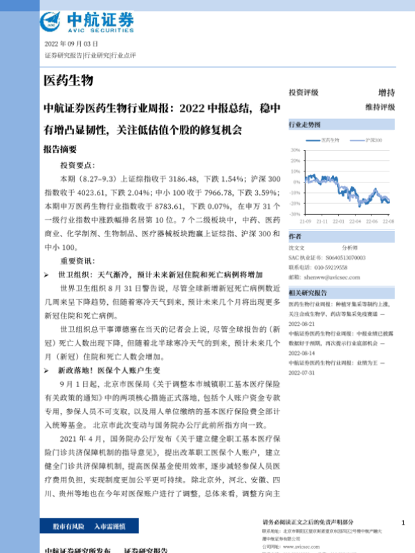 【中航证券】【20220903】医药生物行业周报:2022中报总结,稳中有增凸显韧性,关注低估值个股的修复机会-26页 行业研究