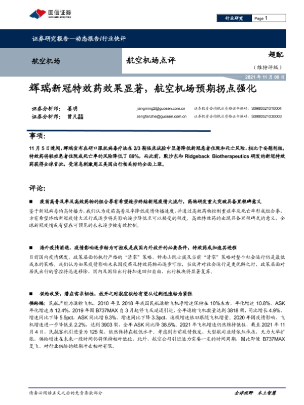 【国信证券】【20211108】航空机场点评:辉瑞新冠特效药效果显著,航空机场预期拐点强化-9页 行业研究