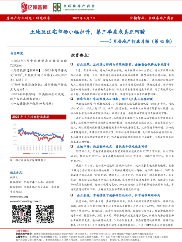【亿翰智库】【20220407】3月房地产行业月报:土地及住宅市场小幅拉升,第三季度或真正回暖-29页 行业研究