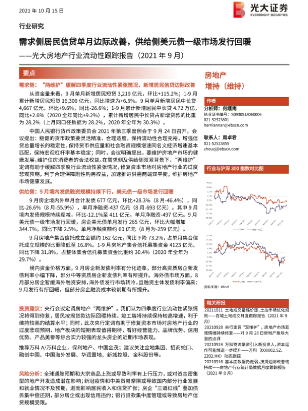 【光大证券】【20211015】光大房地产行业流动性跟踪报告:需求侧居民信贷单月边际改善,供给侧美元债一级市场发行回暖-10页 行业研究