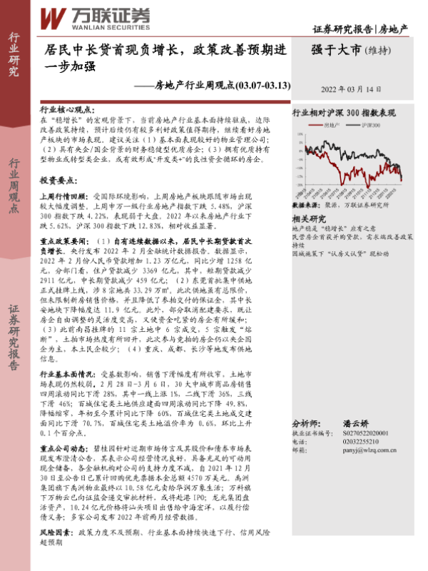 【万联证券】【20220314】居民中长贷首现负增长,政策改善预期进一步加强-13页 行业研究