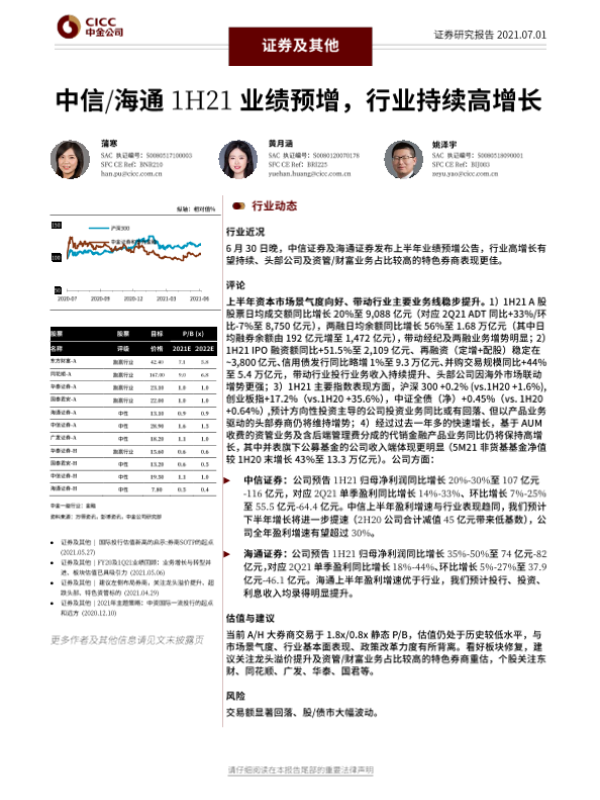 【中金公司】【20210701】中信 海通1H21业绩预增,行业持续高增长-5页 行业研究