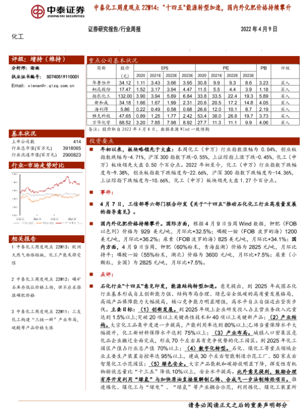 【中泰证券】【20220409】中泰化工周度观点22W14:“十四五”能源转型加速,国内外化肥价格持续攀升-23页 行业研究