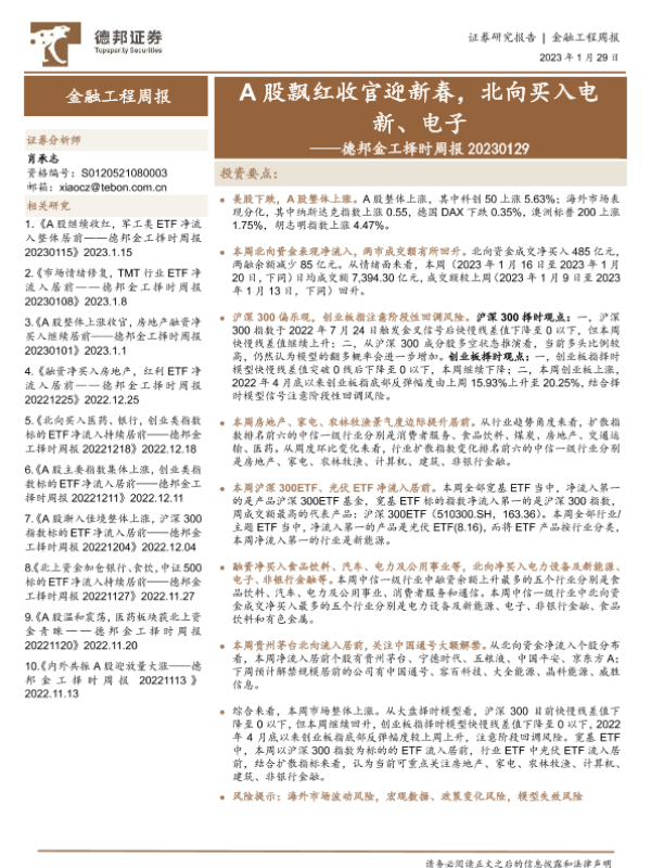 【德邦证券】【20230129】德邦金工择时周报:A股飘红收官迎新春,北向买入电新、电子-26页 行业研究
