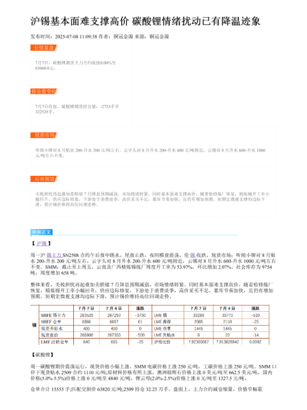 【铜冠金源期货】【20250708】沪锡基本面难支撑高价 碳酸锂情绪扰动已有降温迹象-2页 证券期货研究报告