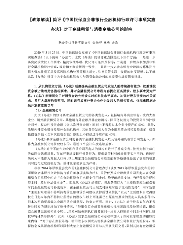 【联合资信】【20200327】简评《中国银保监会非银行金融机构行政许可事项实施办法》对于金融租赁与消费金融公司的影响-3页 政策文件