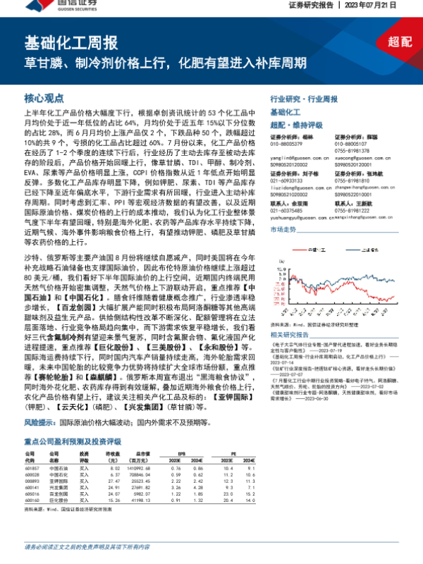 【国信证券】【20230721】基础化工周报:草甘膦、制冷剂价格上行,化肥有望进入补库周期-25页 行业研究