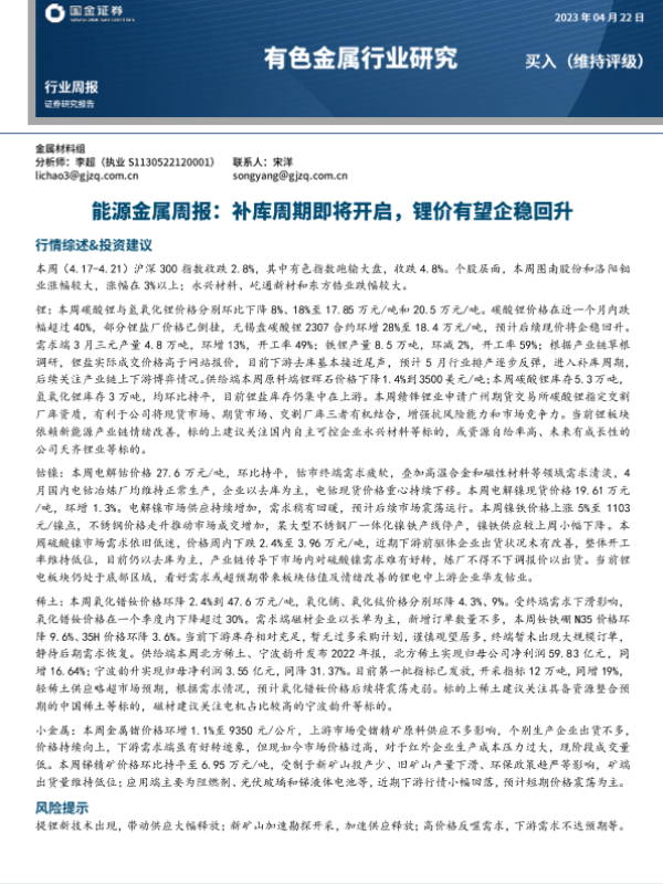 【国金证券】【20230422】20230422-国金证券-能源金属周报:补库周期即将开启,锂价有望企稳回升-16页 行业研究