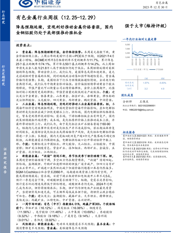 【华福证券】【20231230】20231230-华福证券-有色金属行业周报:降息预期延续,宏观利好推动金属价格普涨,国内金铜铝股仍处于底部强推补涨机会-15页 行业研究