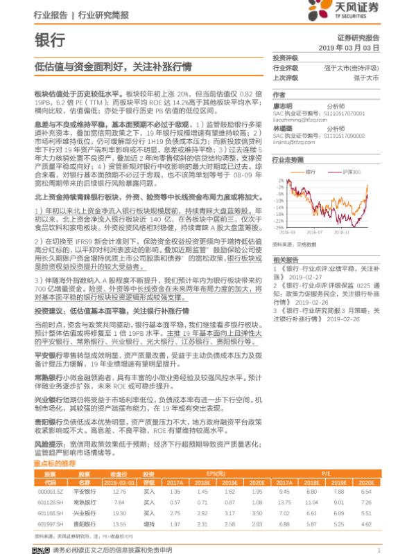【天风证券】【20190303】银行行业研究简报:低估值与资金面利好,关注补涨行情-4页 行业研究