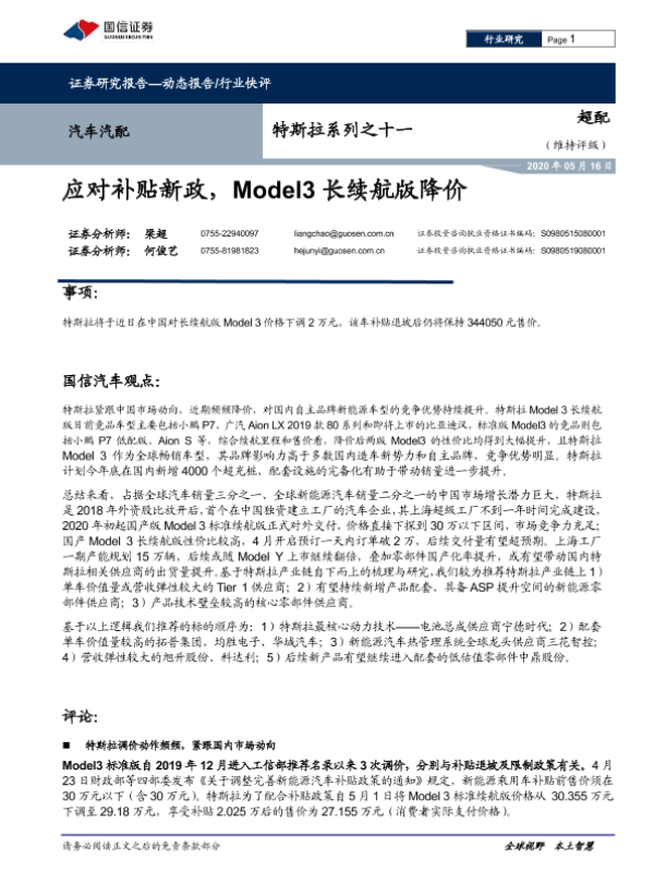 【国信证券】【20200516】特斯拉系列之十一:应对补贴新政,Model3长续航版降价-13页 行业研究