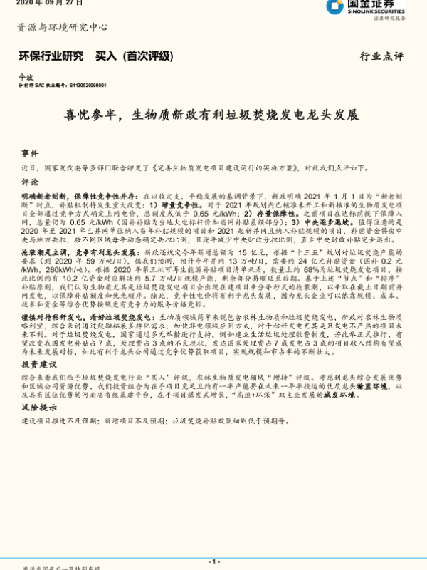 【国金证券】【20200927】喜忧参半,生物质新政有利垃圾焚烧发电龙头发展-3页 行业研究