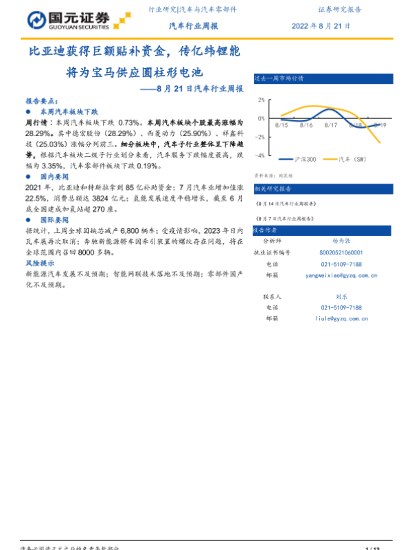 【国元证券】【20220821】20220821-国元证券-汽车行业周报:比亚迪获得巨额贴补资金,传亿纬锂能将为宝马供应圆柱形电池-13页 行业研究