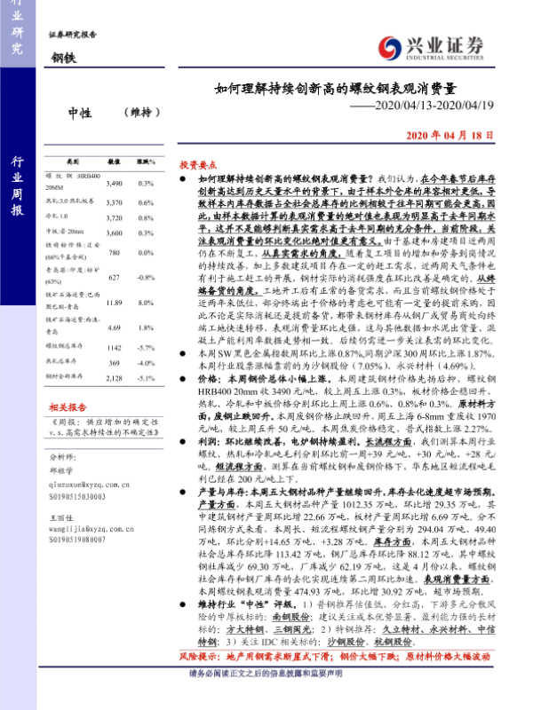 【兴业证券】【20200418】20200418-兴业证券-钢铁行业周报:如何理解持续创新高的螺纹钢表观消费量-17页 行业研究
