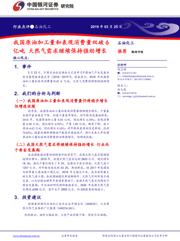 【银河证券】【20190325】我国原油加工量和表观消费量双破6亿吨 天然气需求继续保持强劲增长-3页 行业研究