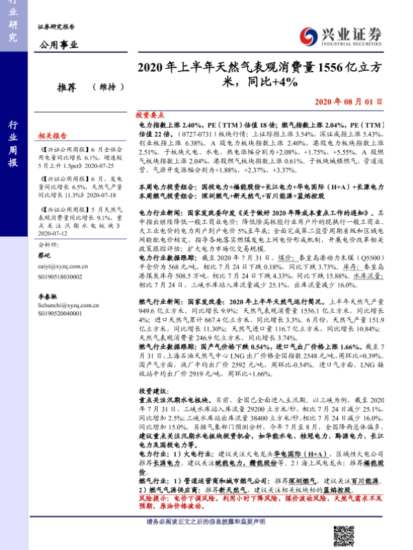 【兴业证券】【20200801】2020年上半年天然气表观消费量1556亿立方米,同比+4%-15页 行业研究