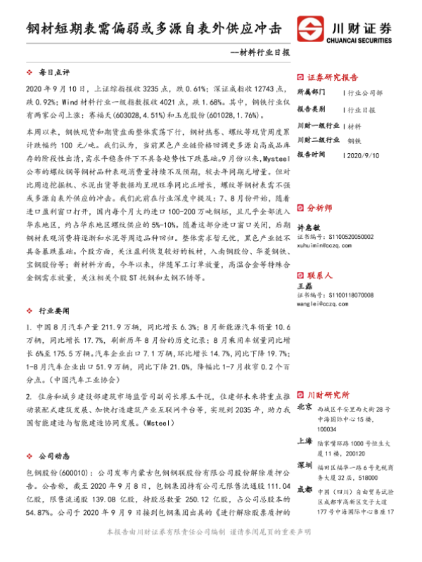 【川财证券】【20200910】材料行业日报:钢材短期表需偏弱或多源自表外供应冲击-3页 证券期货研究报告