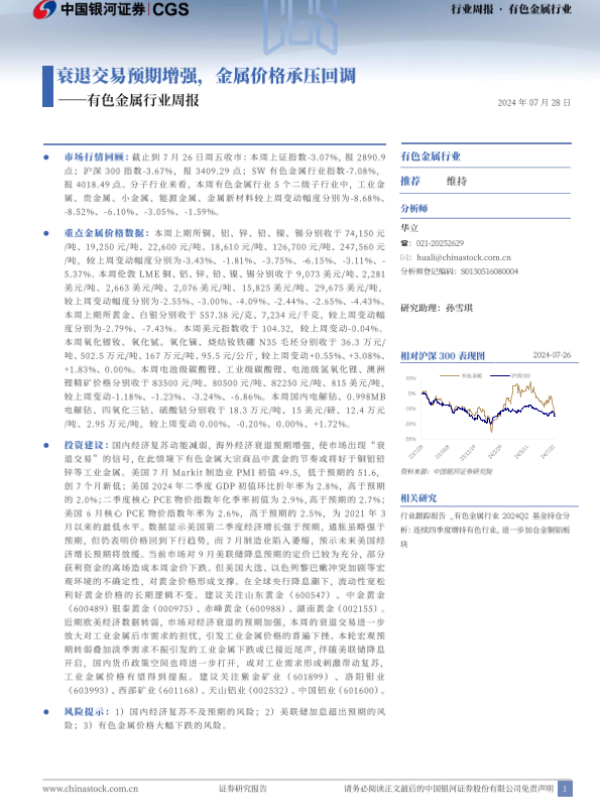 【银河证券】【20240728】20240728-中国银河-有色金属行业周报:衰退交易预期增强,金属价格承压回调-21页 行业研究