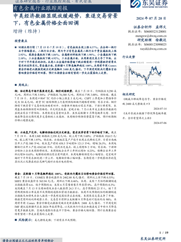 【东吴证券】【20240720】20240720-东吴证券-有色金属行业跟踪周报:中美经济数据显现放缓趋势,衰退交易背景下,有色金属价格全面回调-19页 行业研究