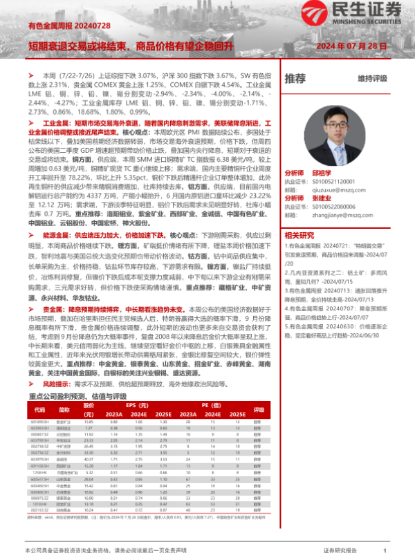【民生证券】【20240728】20240728-民生证券-有色金属周报:短期衰退交易或将结束,商品价格有望企稳回升-29页 行业研究
