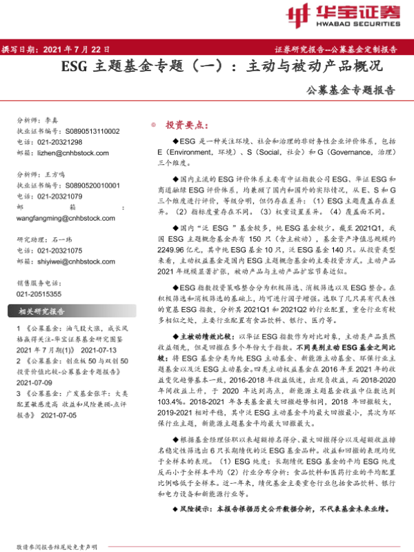 【华宝证券】【20210722】公募基金专题报告:ESG主题基金专题(一),主动与被动产品概况-20页 行业研究