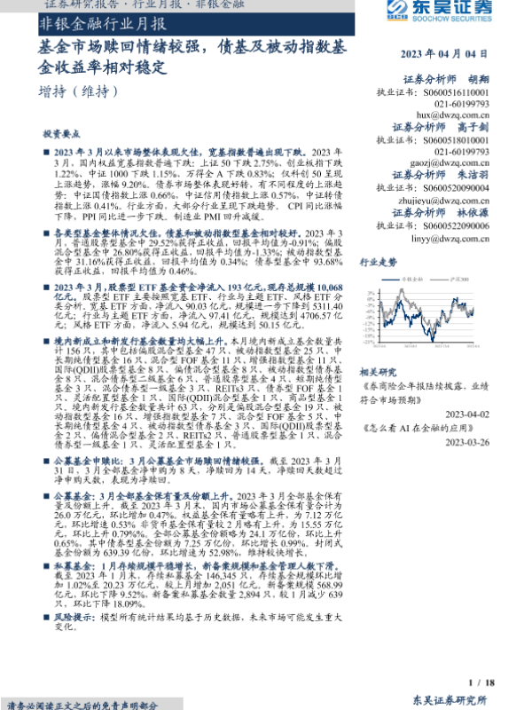 【东吴证券】【20230404】非银金融行业月报:基金市场赎回情绪较强,债基及被动指数基金收益率相对稳定-18页 行业研究