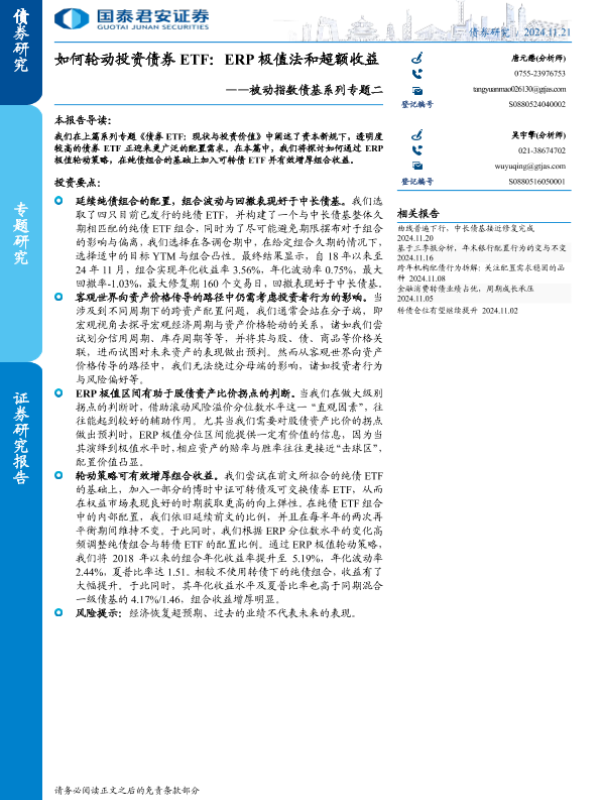 【国泰君安证券】【20241121】被动指数债基系列专题二,如何轮动投资债券ETF:ERP极值法和超额收益-13页 行业研究