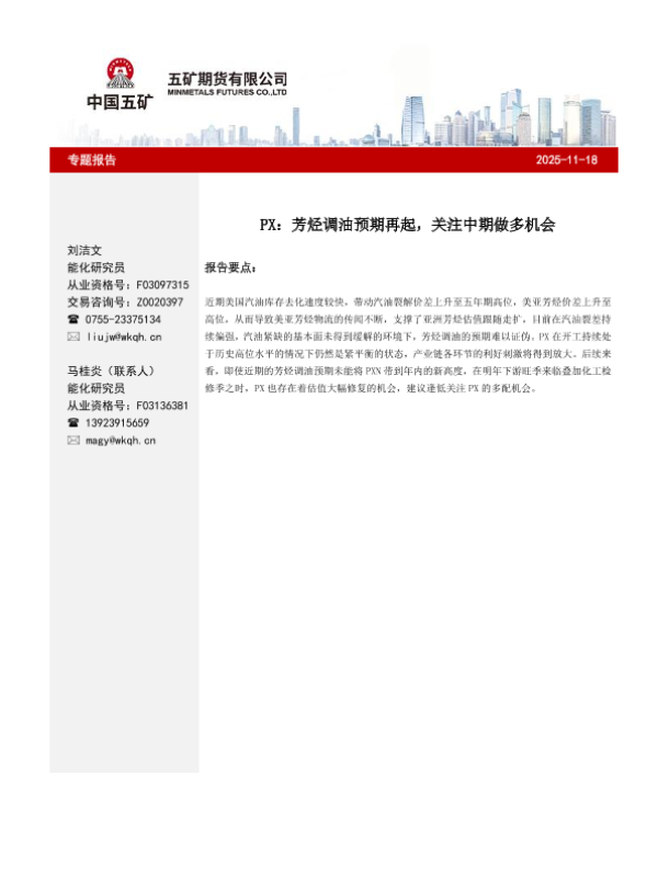 【五矿期货】【202511】PX:芳烃调油预期再起,关注中期做多机会-5页 证券期货研究报告