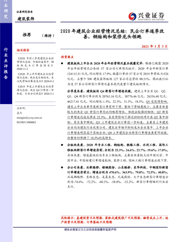 【兴业证券】【20210303】2020年建筑企业经营情况总结:民企订单逐季改善,钢结构和装修龙头领跑-8页 行业研究