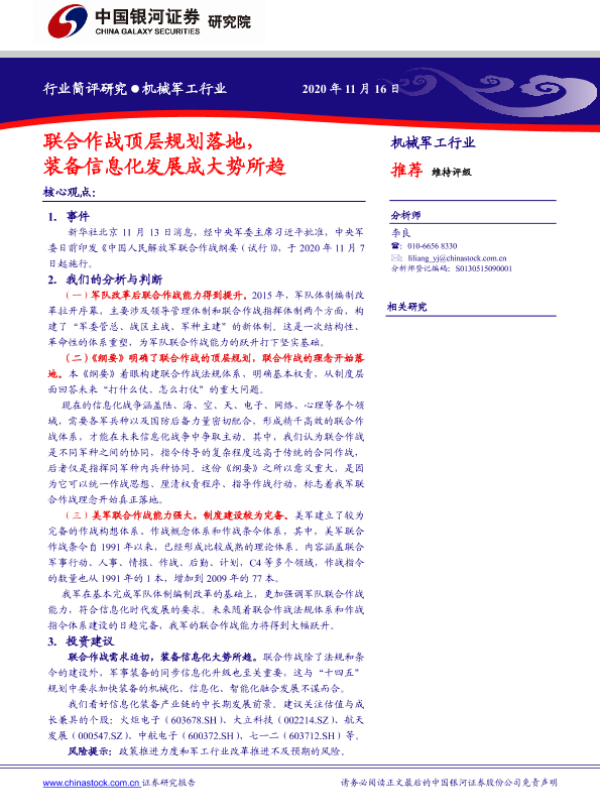 【银河证券】【20201116】机械军工行业简评研究:联合作战顶层规划落地,装备信息化发展成大势所趋-2页 行业研究