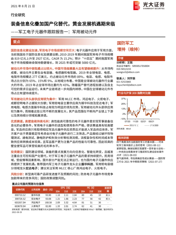 【光大证券】【20210821】国防军工行业军工电子元器件跟踪报告一:军用被动元件,装备信息化叠加国产化替代,黄金发展机遇期来临-16页 行业研究