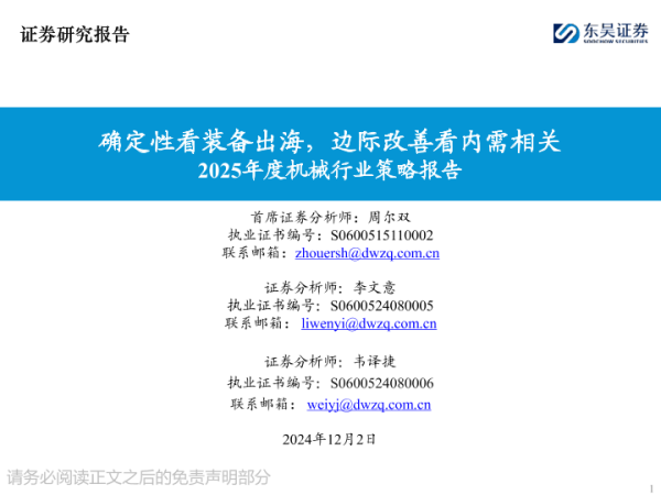 【东吴证券】【20241202】2025年度机械行业策略报告:确定性看装备出海,边际改善看内需相关-148页 行业研究