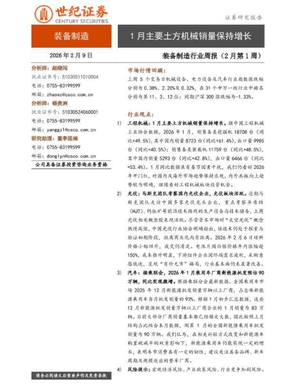 【世纪证券】【202602】1月主要土方机械销量保持增长-9页 证券期货研究报告