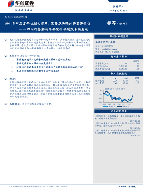【华创证券】【20190306】军工行业跟踪报告:四问四答解析军品定价机制改革的影响-8页 行业研究