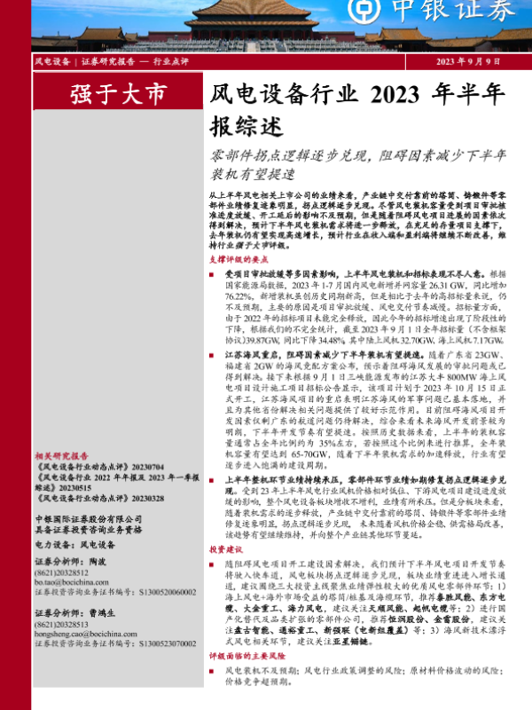 【中银证券】【20230909】风电设备行业2023年半年报综述:零部件拐点逻辑逐步兑现,阻碍因素减少下半年装机有望提速-17页 行业研究