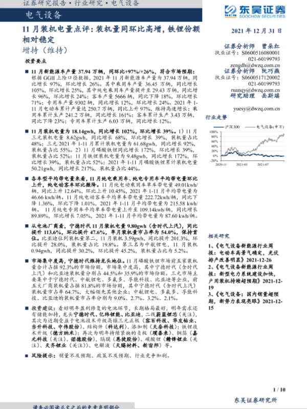 【东吴证券】【20211231】电气设备11月装机电量点评:装机量同环比高增,铁锂份额相对稳定-10页 行业研究