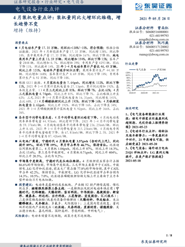 【东吴证券】【20210528】4月装机电量点评:装机量同比大增环比维稳,增长趋势不变-8页 行业研究