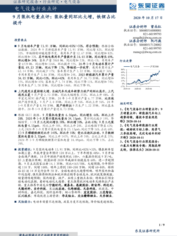 【东吴证券】【20201017】20201017-东吴证券-电气设备行业点评-9月装机电量点评:装机量同环比大增,铁锂占比提升-9页 行业研究