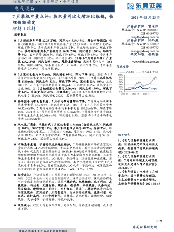 【东吴证券】【20210823】7月装机电量点评:装机量同比大增环比维稳,铁锂份额稳定-9页 行业研究