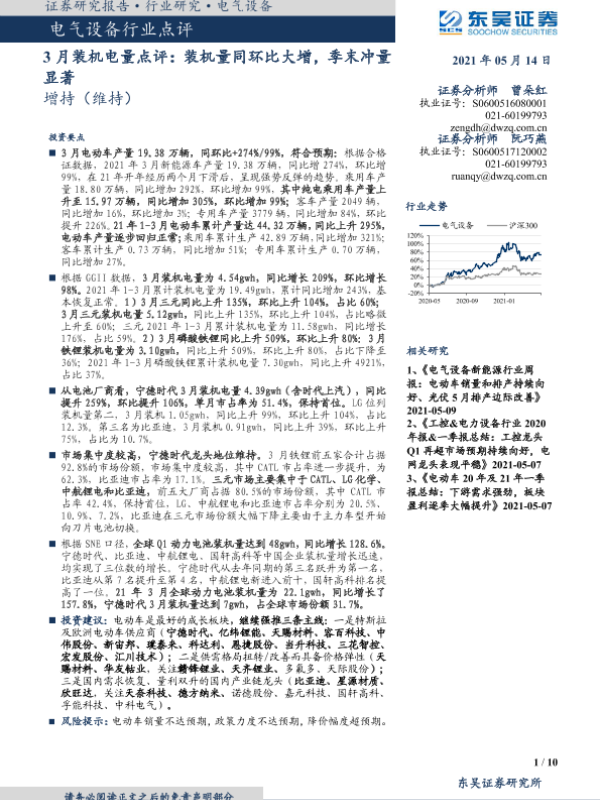 【东吴证券】【20210514】电气设备行业点评:3月装机电量点评:装机量同环比大增,季末冲量显著-10页 行业研究