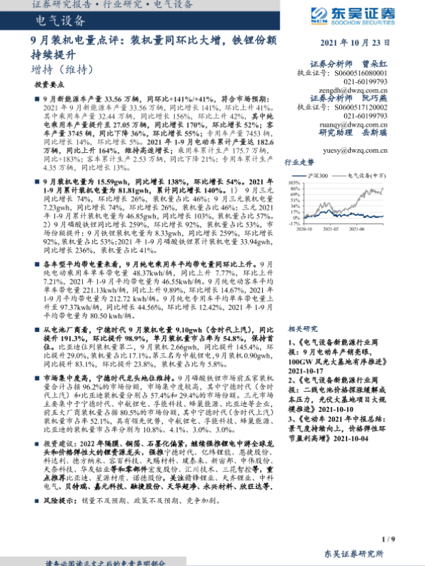【东吴证券】【20211023】9月装机电量点评:装机量同环比大增,铁锂份额持续提升-9页 行业研究