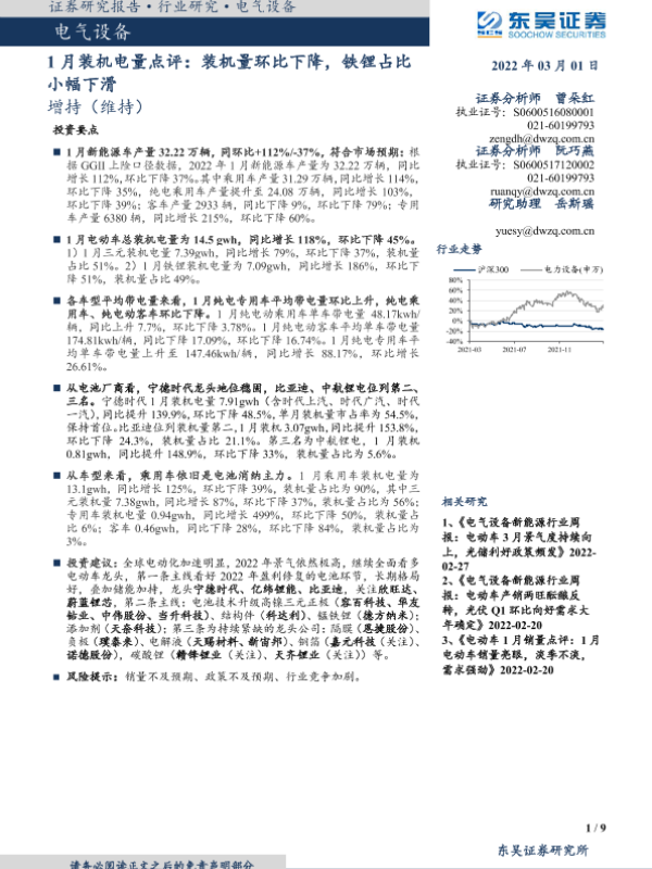 【东吴证券】【20220301】1月装机电量点评:装机量环比下降,铁锂占比小幅下滑-9页 行业研究