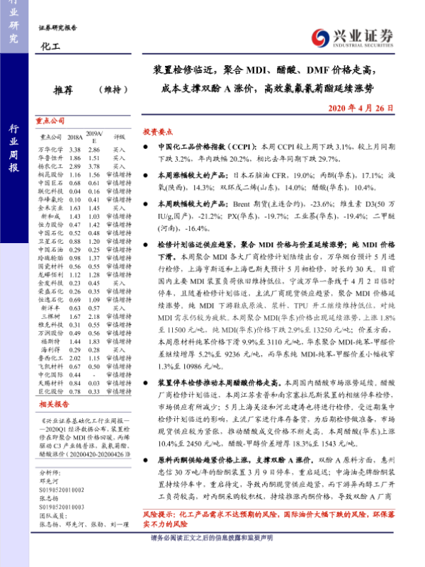 【兴业证券】【20200426】装置检修临近,聚合MDI、醋酸、DMF价格走高,成本支撑双酚 A 涨价,高效氯氟氰菊酯延续涨势-36页 行业研究