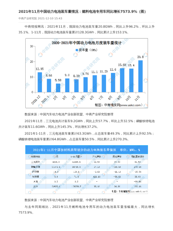 【中商产业研究院】【20211210】2021年11月中国动力电池装车量情况:燃料电池专用车同比增长7573.9%-2页 行业研究