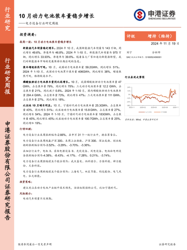 【申港证券】【20241119】10月动力电池装车量稳步增长——电力设备行业研究周报-10页 行业研究