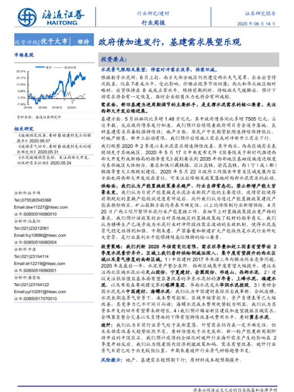 【海通证券】【20200614】建材行业周报:政府债加速发行,基建需求展望乐观-3页 行业研究