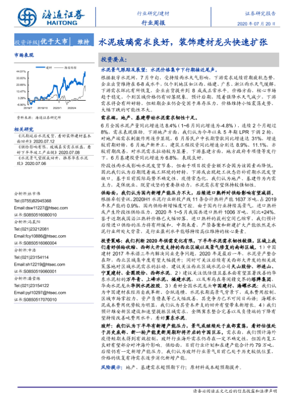 【海通证券】【20200720】建材行业周报:水泥玻璃需求良好,装饰建材龙头快速扩张-3页 行业研究