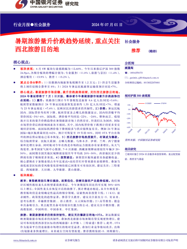 【银河证券】【20240701】社会服务行业月报:暑期旅游量升价跌趋势延续,重点关注西北旅游目的地-13页 行业研究